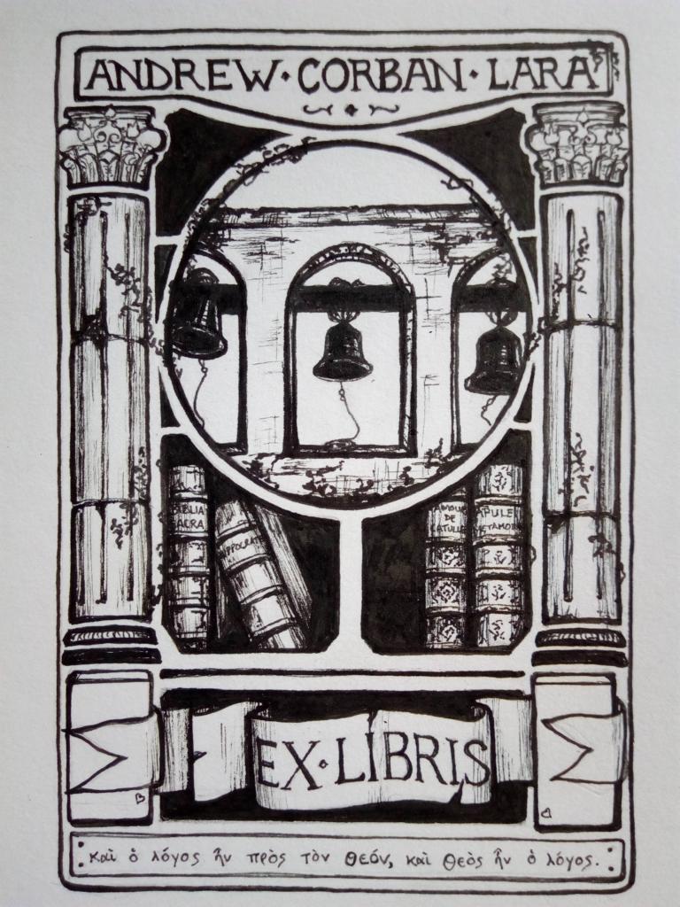 I’ve only ever designed bookplates for family and friends in the past – so it was fascinating to go through the process of finding out enough about a total stranger to design them something personal. The winning bidder was Andrew Lara, from California. Andrew is the sort of classicist who makes me wonder what I’ve been doing with my life! He studies Greek and Latin, enjoys reading the Bible in both languages, and reads Catullus for fun – but in his professional life he’s a critical care nurse, dealing with the very worst of our current situation. And he still finds time to serve as an elected official in his community, and stand for election to the city council. Oh – and he has a family too!