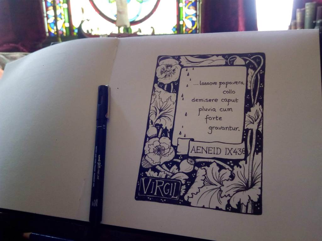 I should perhaps mention that, while I may not be an artist, I’m definitely not a graphic designer either, A Level notwithstanding. I can’t draw a straight line to save my life (bookplates are created by means of drawing round a Loeb volume!), and I don’t know my way around any computer design software. I’m just a person with some paper and a pen.
