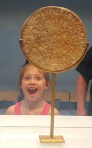 I first saw the Phaistos disc on a holiday with my husband David. I’d heard of the Phaistos disc, I knew what it was, but was blown away when I saw it in the archaeological museum in Heraklion. Since then I have brought my parents to Crete, and later took my daughter. I think my enthusiasm for this object has been seen as a bit OTT, and perhaps my parents’ expectations were for something more dramatic and exciting than a 15cm diameter circle embossed with strange markings.