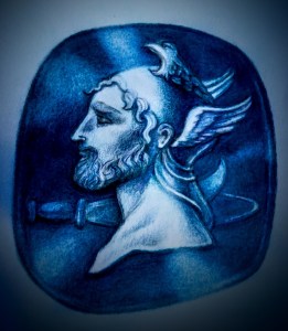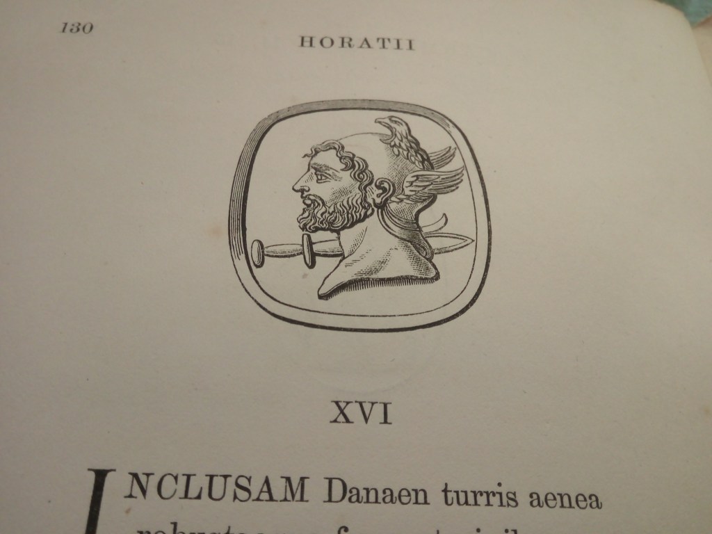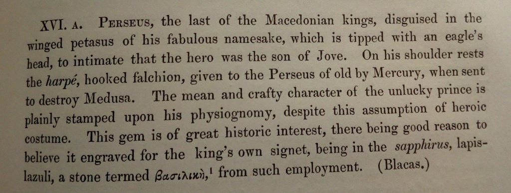 The book I was looking at (published in 1869, only a couple of years after this particular stone was acquired by the British Museum – and that’s an interesting story which I won’t go into here) describes this as an eagle’s head, indicating a connection with Zeus. That seemed fair enough. After all, once I started looking, a lot of Perseus’ coins are notable for the large eagle on the reverse. So an eagle helmet would be understandable – even if I had my doubts about how well it would fit with the wings on either side (with the rounded helmet in between, the whole thing might have looked rather ostrich-like).
