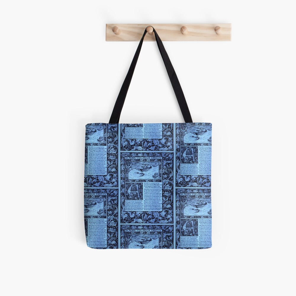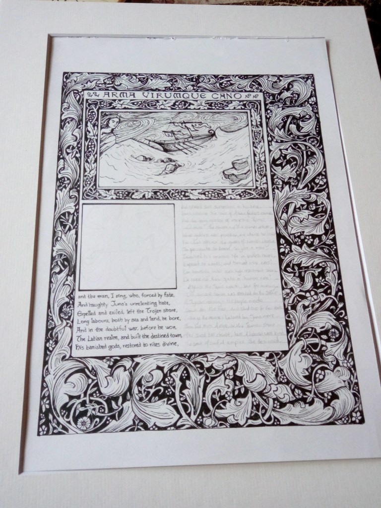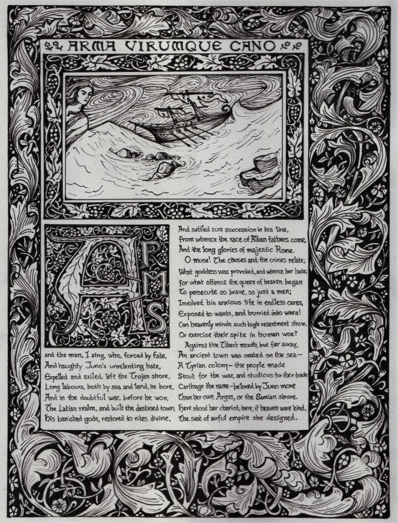 This design was a labour of love over quite a number of days. I’m a huge fan of William Morris’s design work, particularly in his books, and had always wanted to try to copy the illustrated/illuminated Chaucer that he produced with Burne-Jones. But instead of straight copying, I thought I would see whether I could adapt their style to an illustrated page of Virgil’s Aeneid. It was definitely a challenge! I opted for Dryden’s translation, mainly on practical grounds, because Dryden’s lines are both short and more consistent in length than most translations.