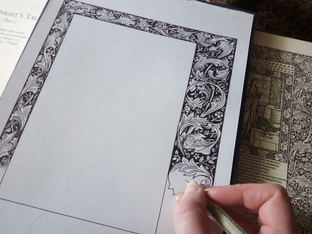 It left me with a new respect for what Morris achieved with this book, which for him and Burne-Jones was a Sunday project spanning four years. The borders are so intricate that I couldn’t even come close: I could manage the basic style, but the original designs have an extra layer of tiny detail that I just had to give up on. Burne-Jones’ illustrative style is so distinctive that, again, I couldn’t quite capture it. But still, I had the best time doing it!