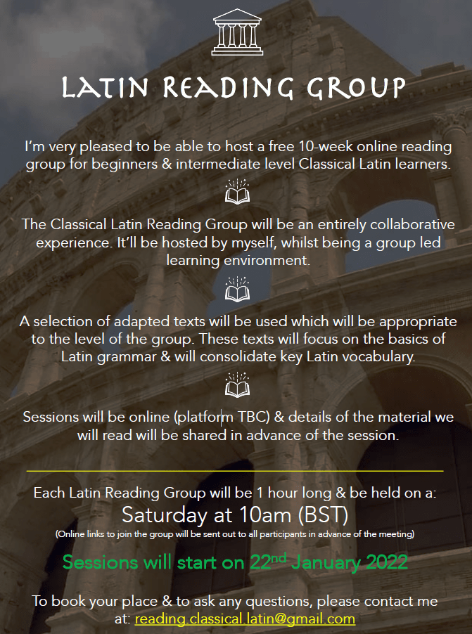 Another thing to note is a new free Latin reading group run by OU graduate Tony Potter. If you’d like to brush up on your Latin on a Saturday morning, drop Tony a message at reading.classical.latin@gmail.com. It sounds like a lot of fun!