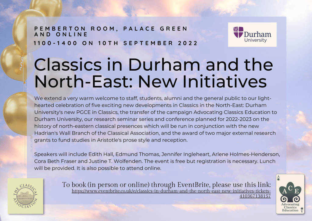 Our launch will be part of a bigger event on Saturday in Durham, celebrating lots of exciting developments in the North-East – and everyone is welcome to attend. But do book quickly, because the in-person event will have limited spaces! Booking can be done through Eventbrite, using this link: https://www.eventbrite.co.uk/e/classics-in-durham-and-the-north-east-new-initiatives-tickets-410367138157 …and there is an option for online attendance if you’d like to be involved but can’t make it to Durham in person.