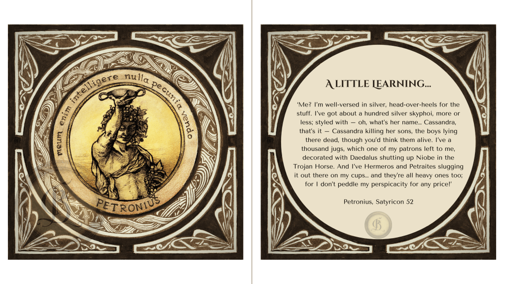For my contribution, I thought I’d try to do a book-style illustration every day, featuring a passage of Latin literature related to the day’s prompt. I asked a friend of mine (@DocCrom on Twitter, who posts the loveliest ancient stuff every day, always with impeccable referencing) to do the translations. My own translating skills are effective but definitely not elegant!