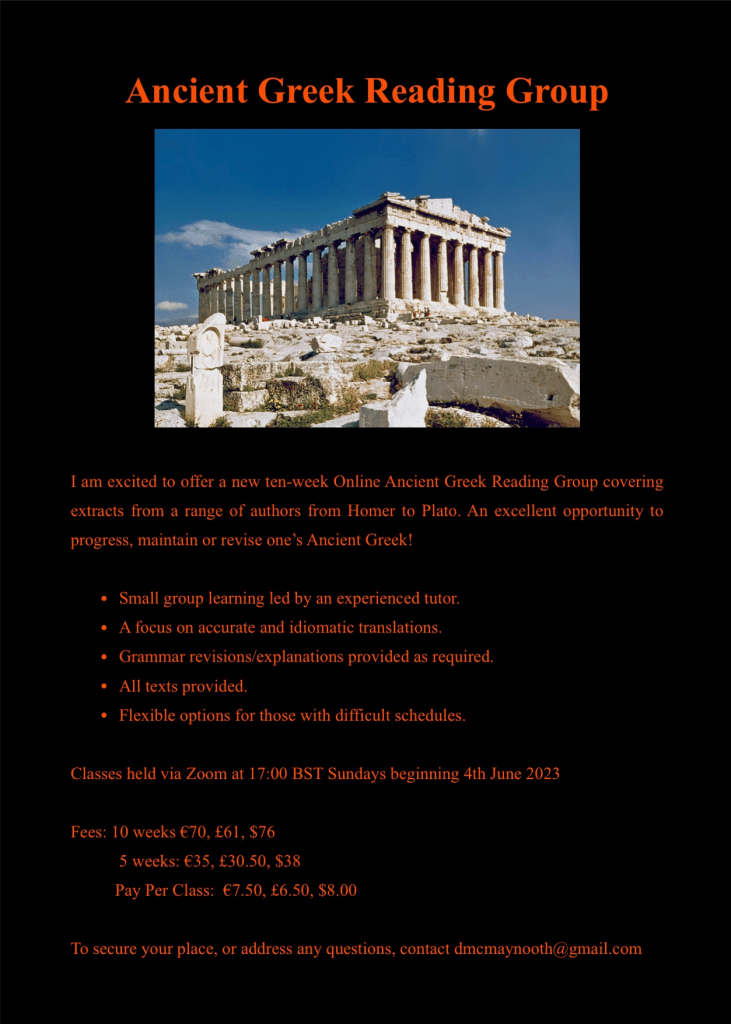 If you’re interested in further language work but can’t commit to a full summer school, you could check out Derek McCann’s very popular Ancient Greek online reading group…